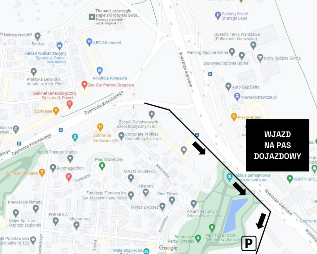 - Wjazd na parkingi jest możliwy jedynie z pasa bocznego od strony Wybrzeża Gdyńskiego w kierunku Centrum. Należy zjechać z Wisłostrady przed skrzyżowaniem z ul. Krasińskiego.